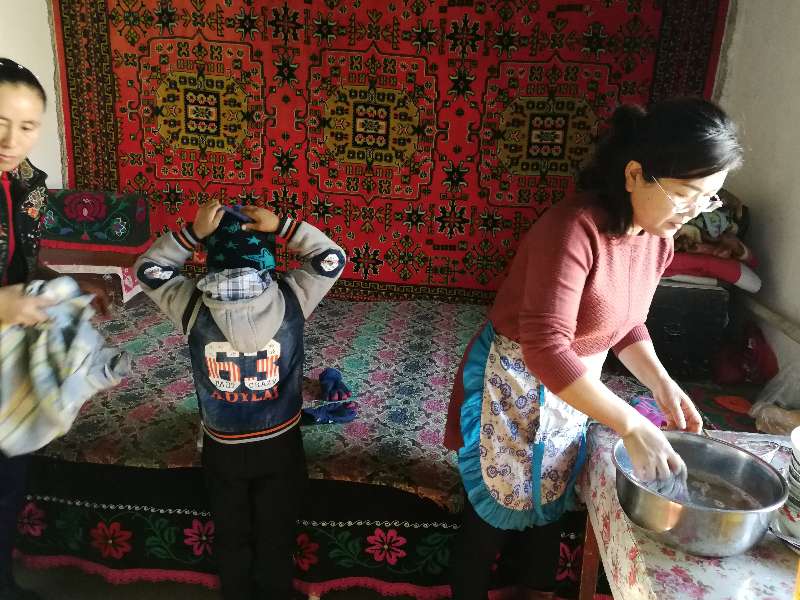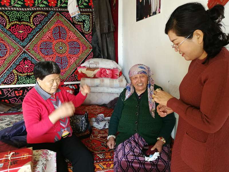 2018年12月8日,师市信访局副调研员许瑞华通过微信了解到肯杰古丽的婆婆身体不舒服。12月9日,许瑞华夫妇便带着母亲来到了民族亲戚肯杰古丽的家中探望,许瑞华的母亲特地为肯杰古丽带去了具有地域特色的手串项链等礼物及生活慰问品,许瑞华还和亲戚们一起学宪法、做家务,其乐融融,度过了一个愉快的周末。