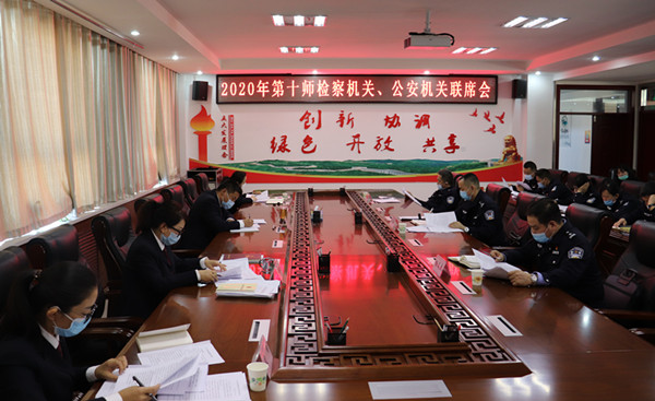 为加强检察机关和公安机关在刑事案件办理工作中的衔接配合,构建良好的新型诉侦关系,规范执法办案,提高办案质效,推动落实认罪认罚、“案-件比”制度,近日,第十师检察分院组织召开了2020年第十师检察机关、公安机关联席会,第十师检察机关两级三院分管领导、刑事检察部主任、第十师公安机关两级三局主管领导、刑警队负责人、法制办负责人参加会议。