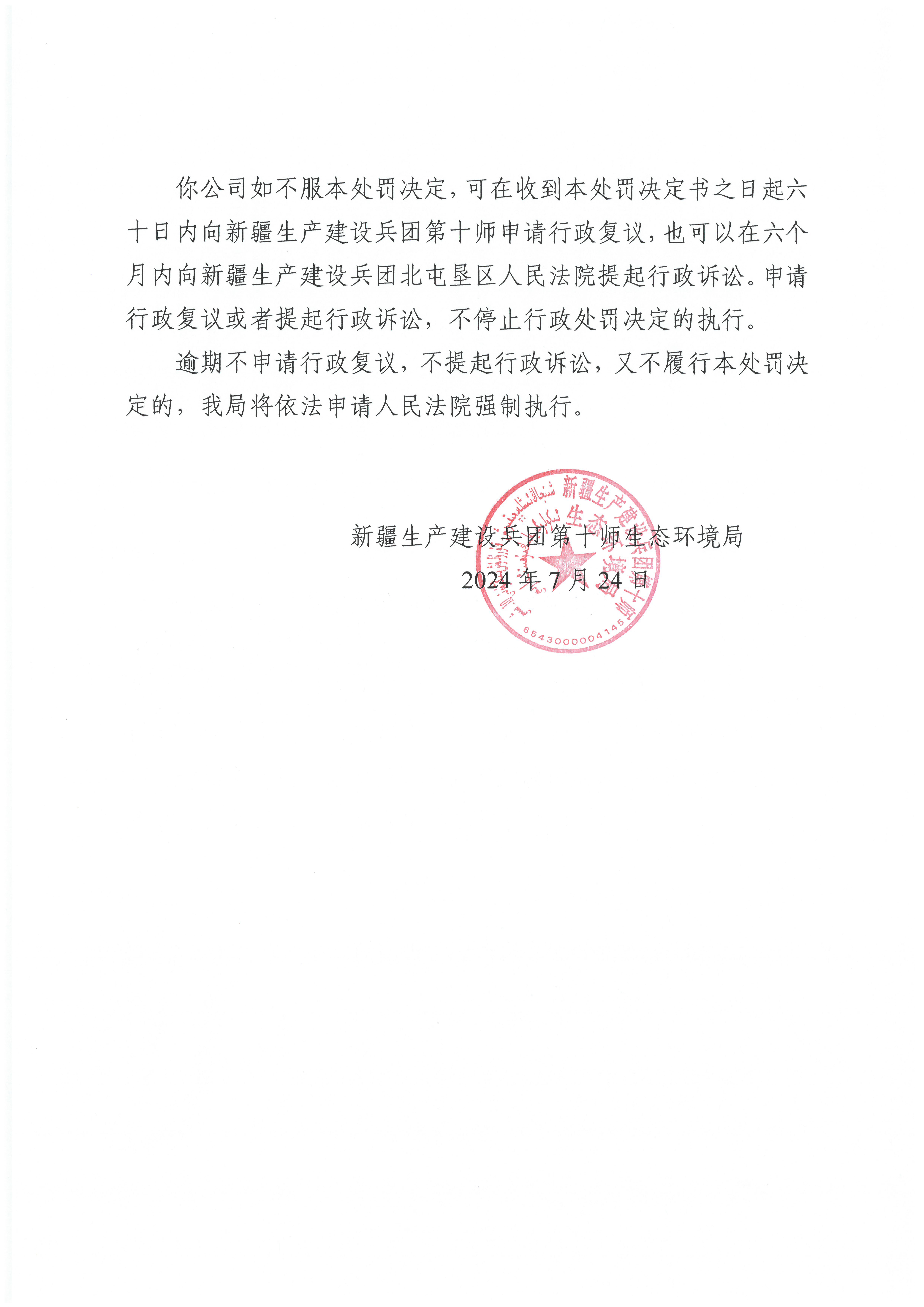 新疆生产建设兵团第十师生态环境局行政处罚决定书 十师环罚〔2024〕6号