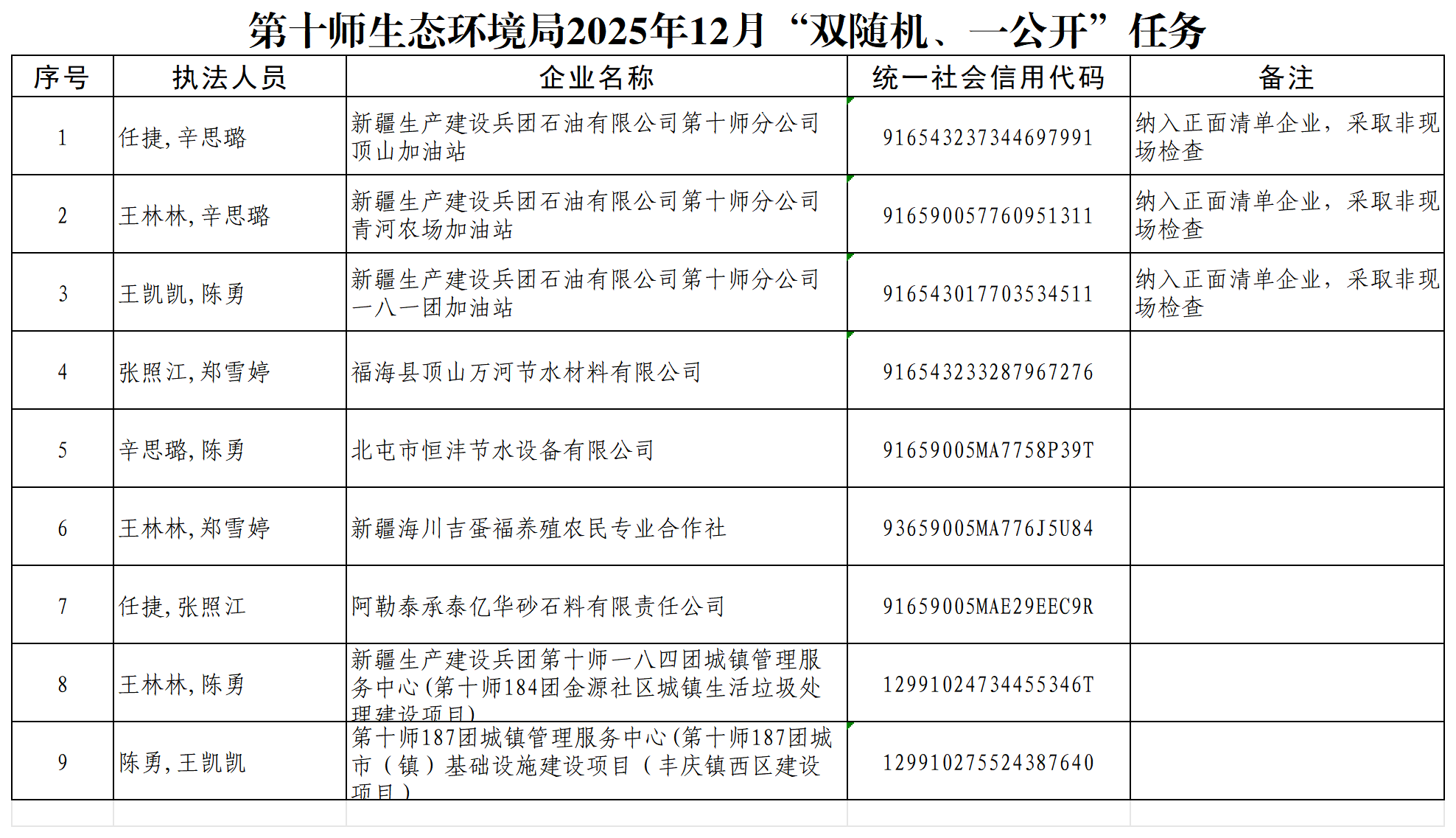 第十师生态环境局2025年12月“双随机、一公开”任务