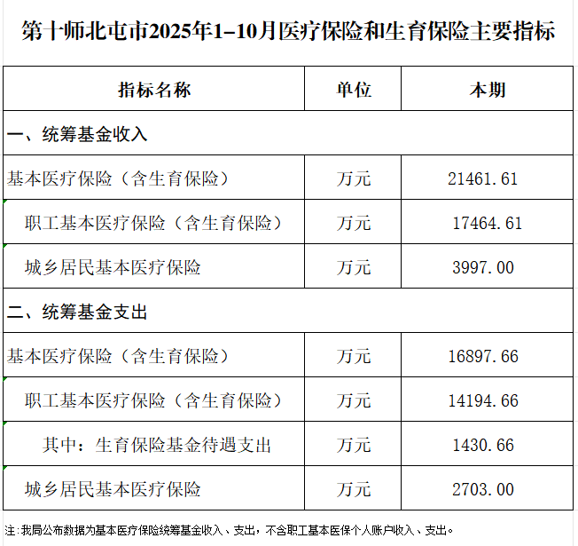 第十师北屯市2025年1-10月医疗保险和生育保险主要指标