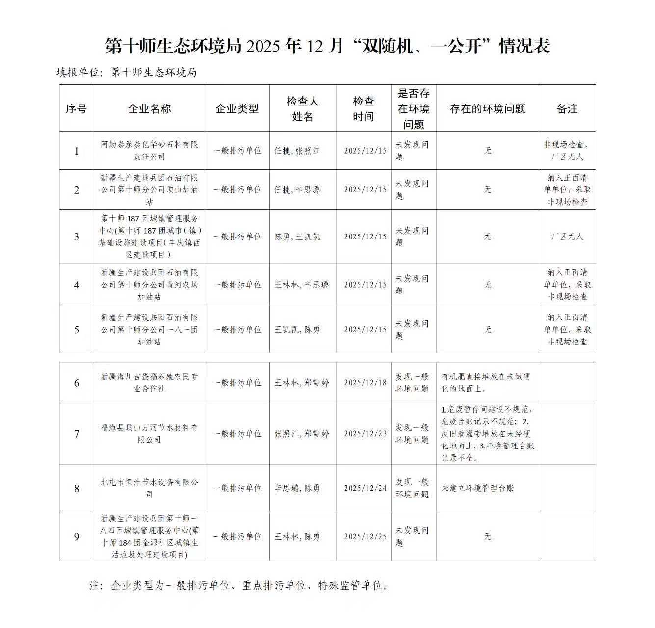 第十师生态环境局2025年12月“双随机、一公开”情况表