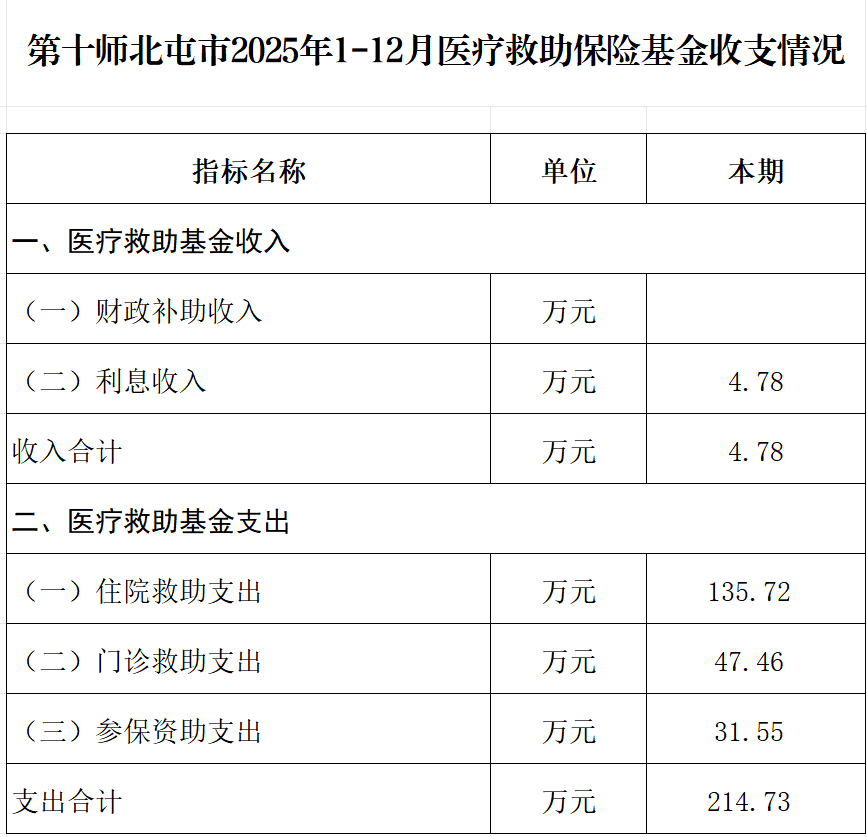 第十师北屯市2025年1-12月医疗救助保险基金收支情况