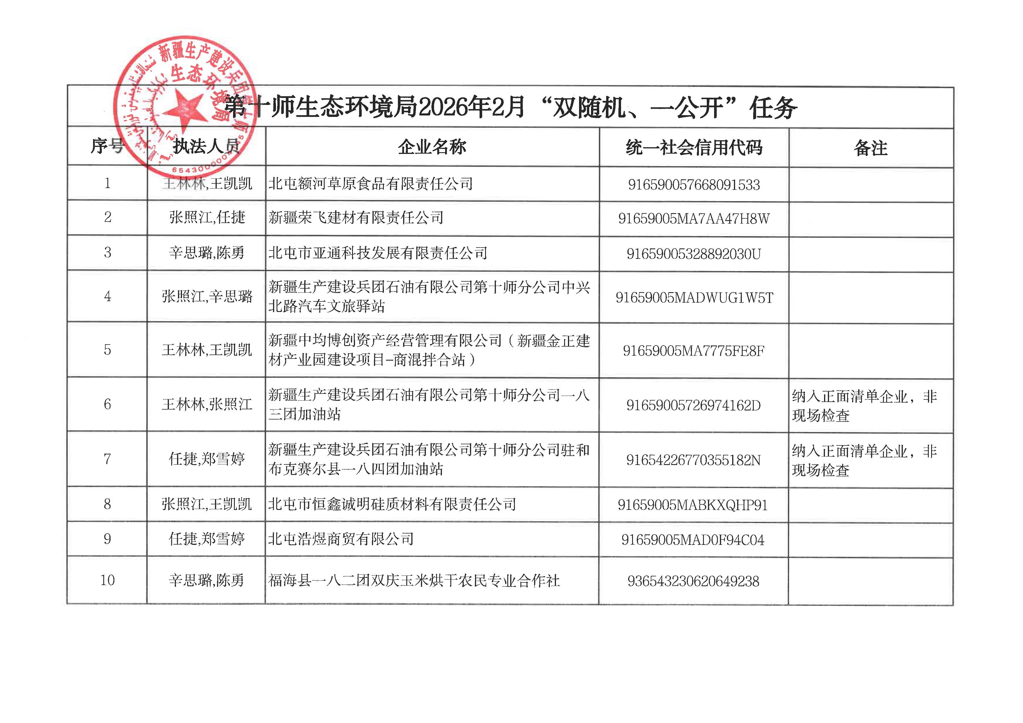 第十师生态环境局2026年2月“双随机、一公开”任务