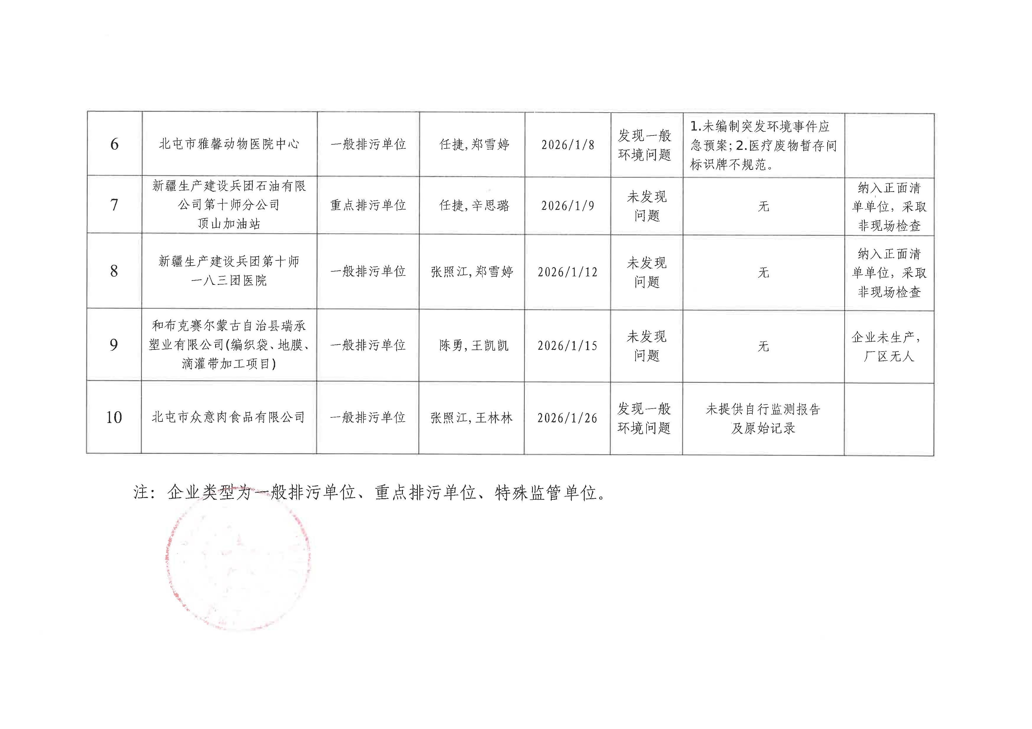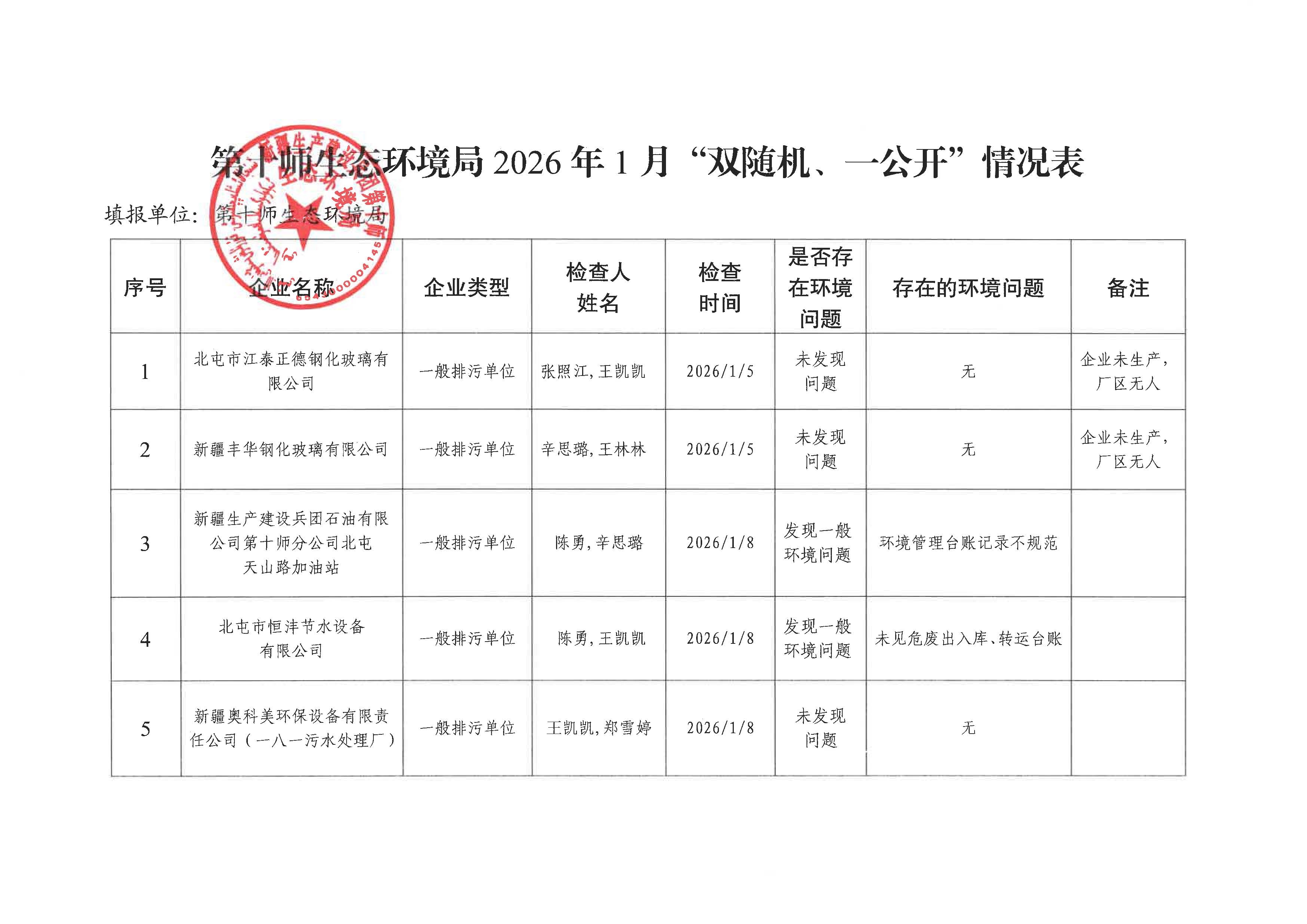 第十师生态环境局2026年1月“双随机、一公开”情况表