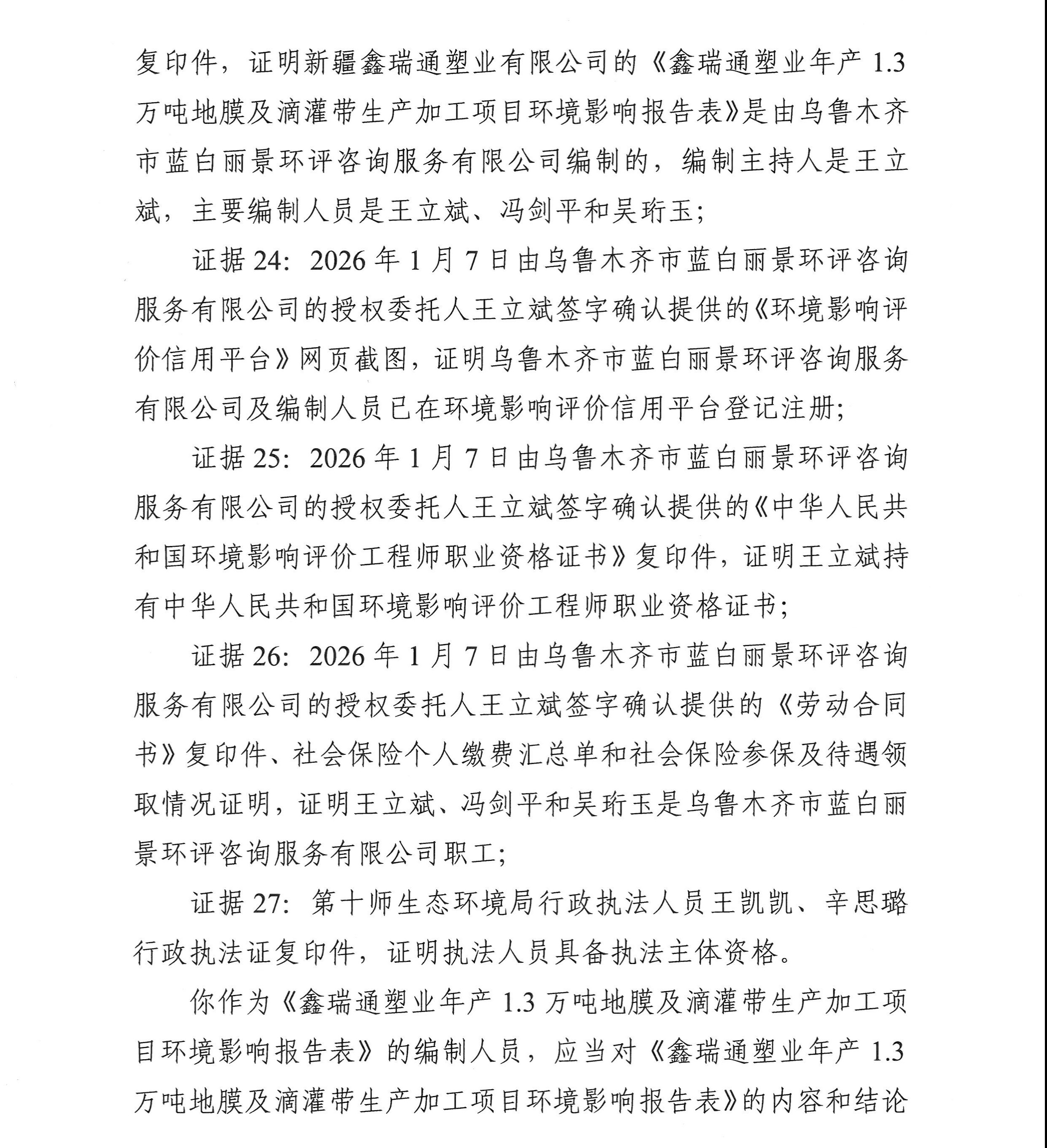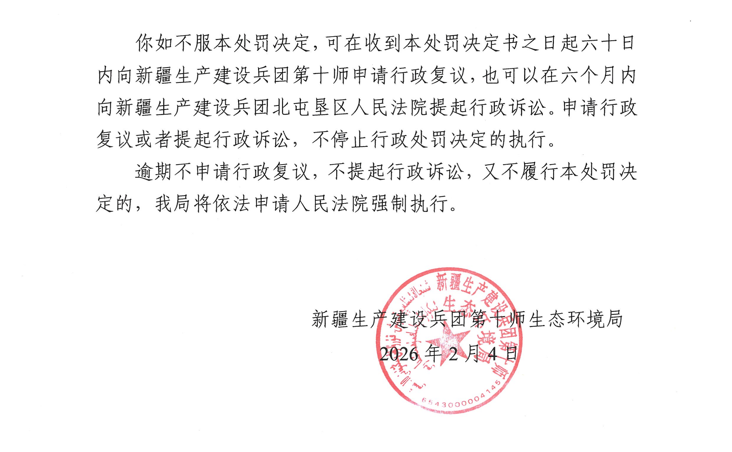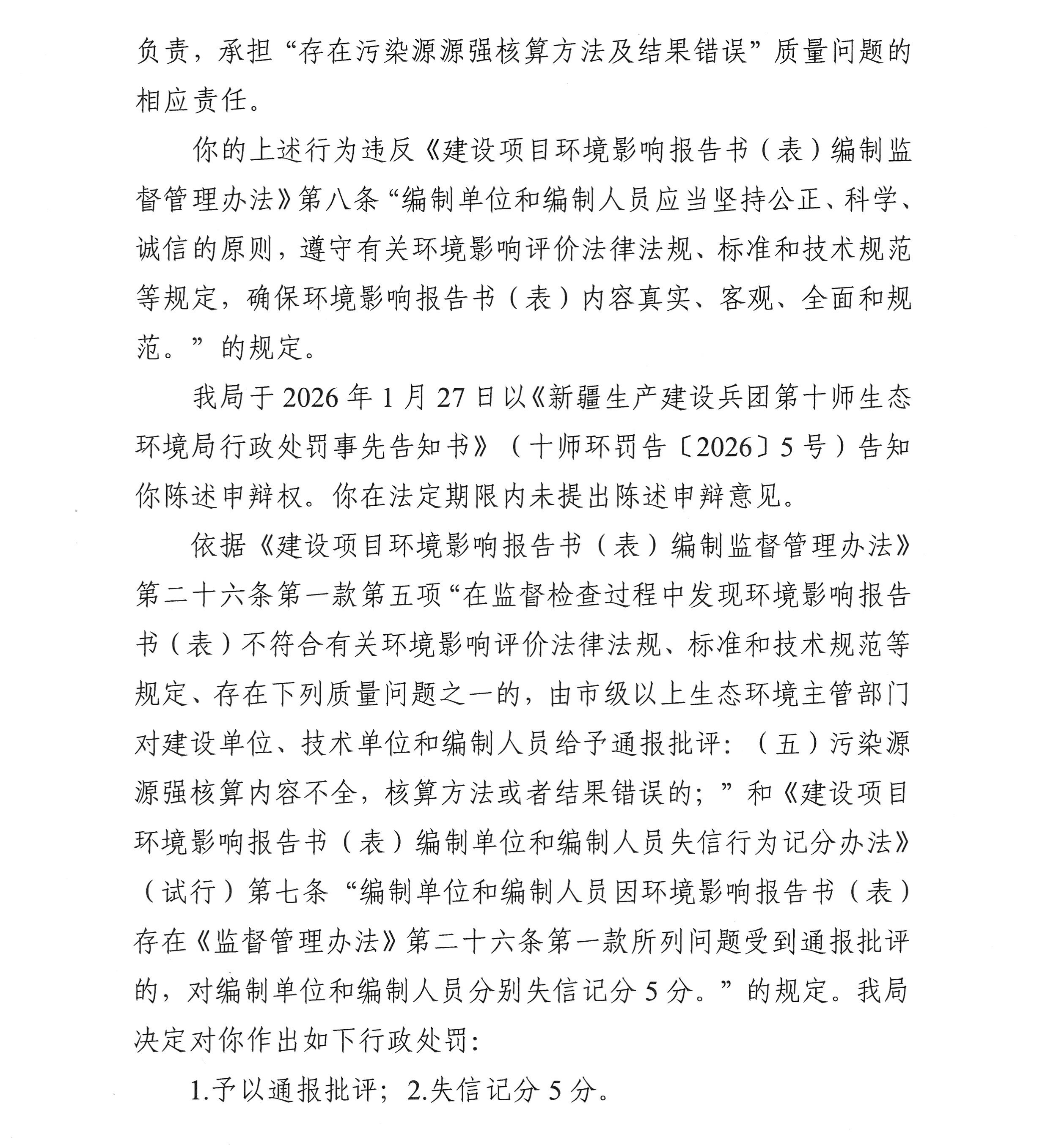 新疆生产建设兵团第十师生态环境局行政处罚决定书(十师环罚〔2026〕5号)