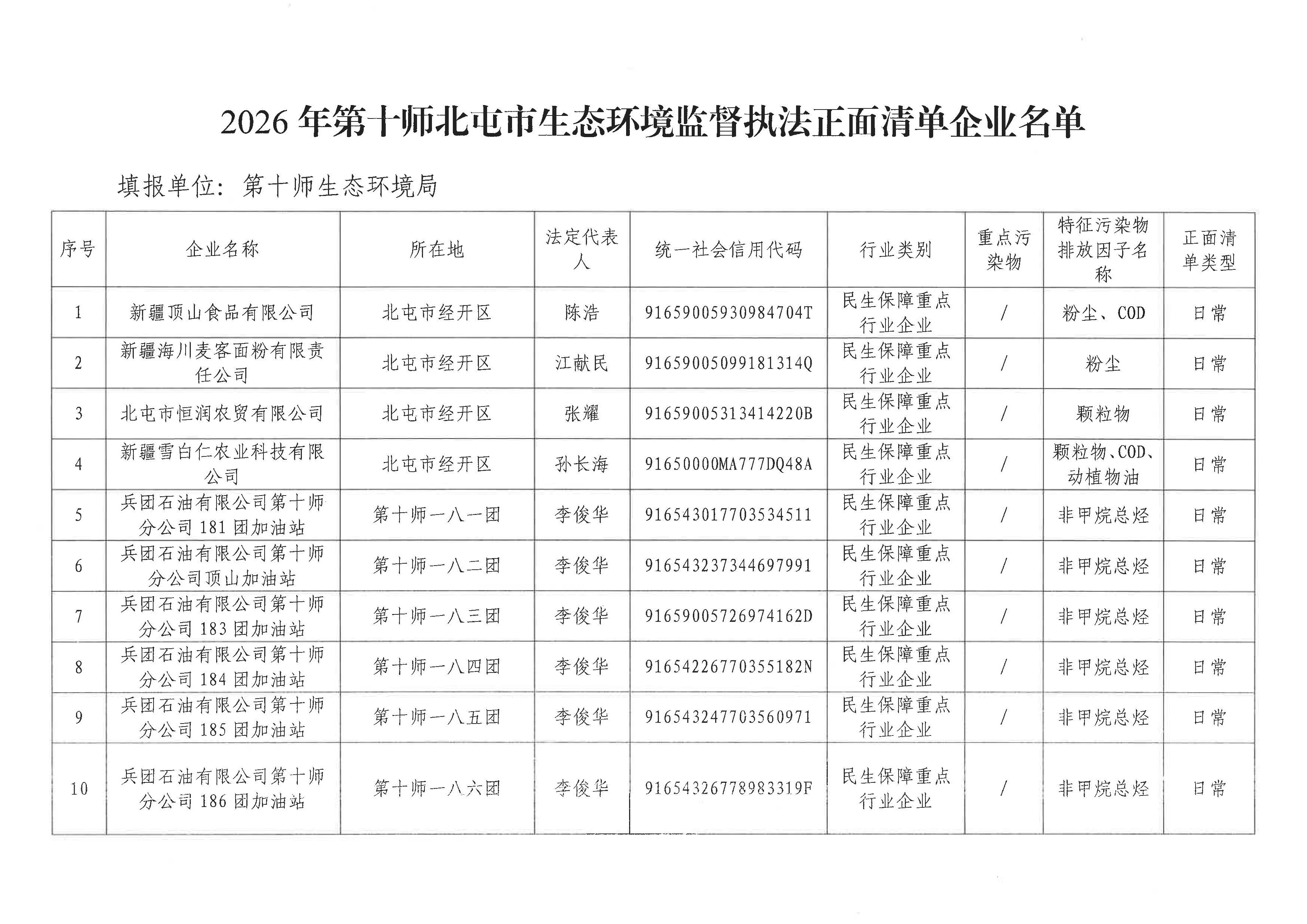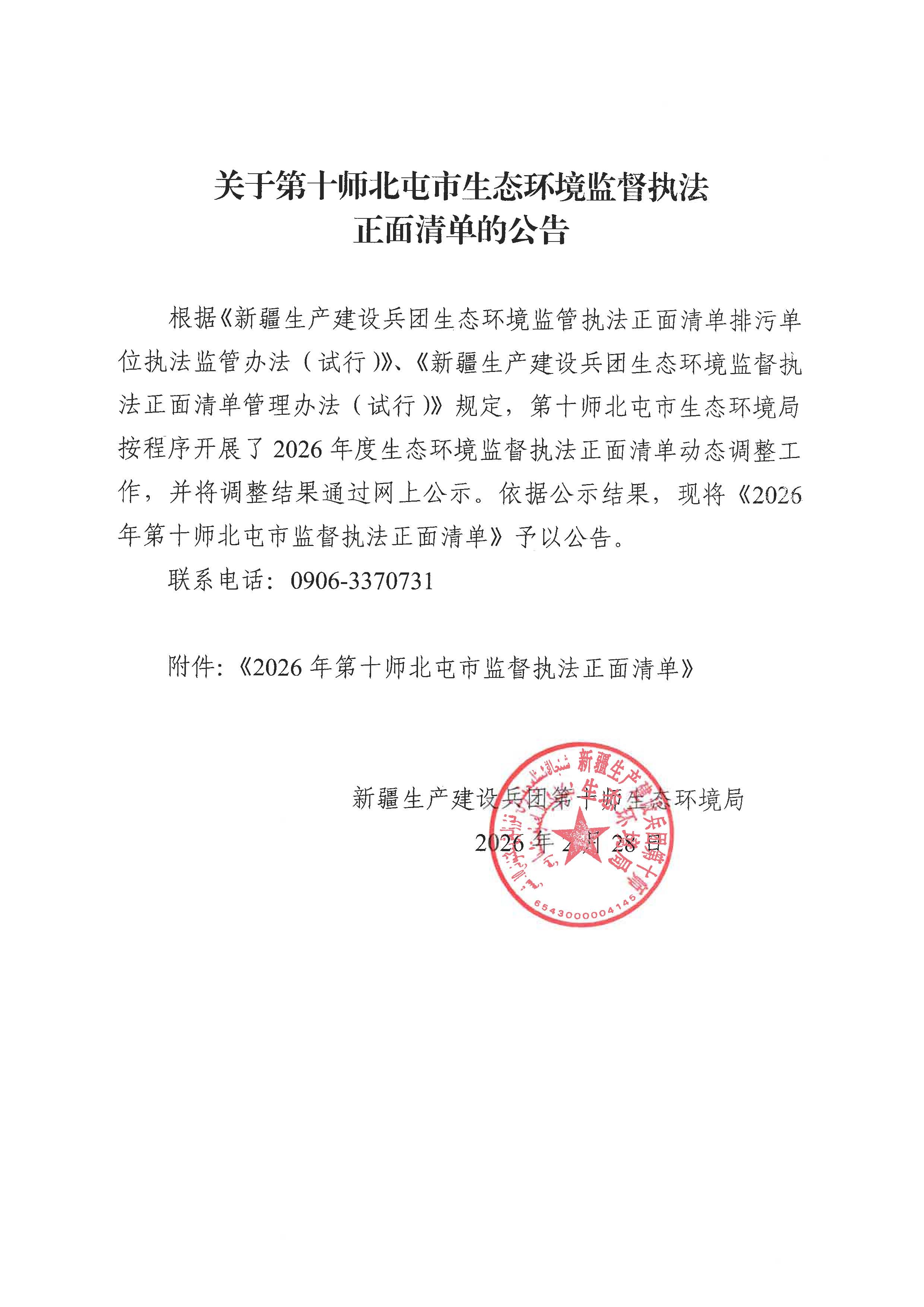 关于第十师北屯市生态环境监督执法正面清单的公告