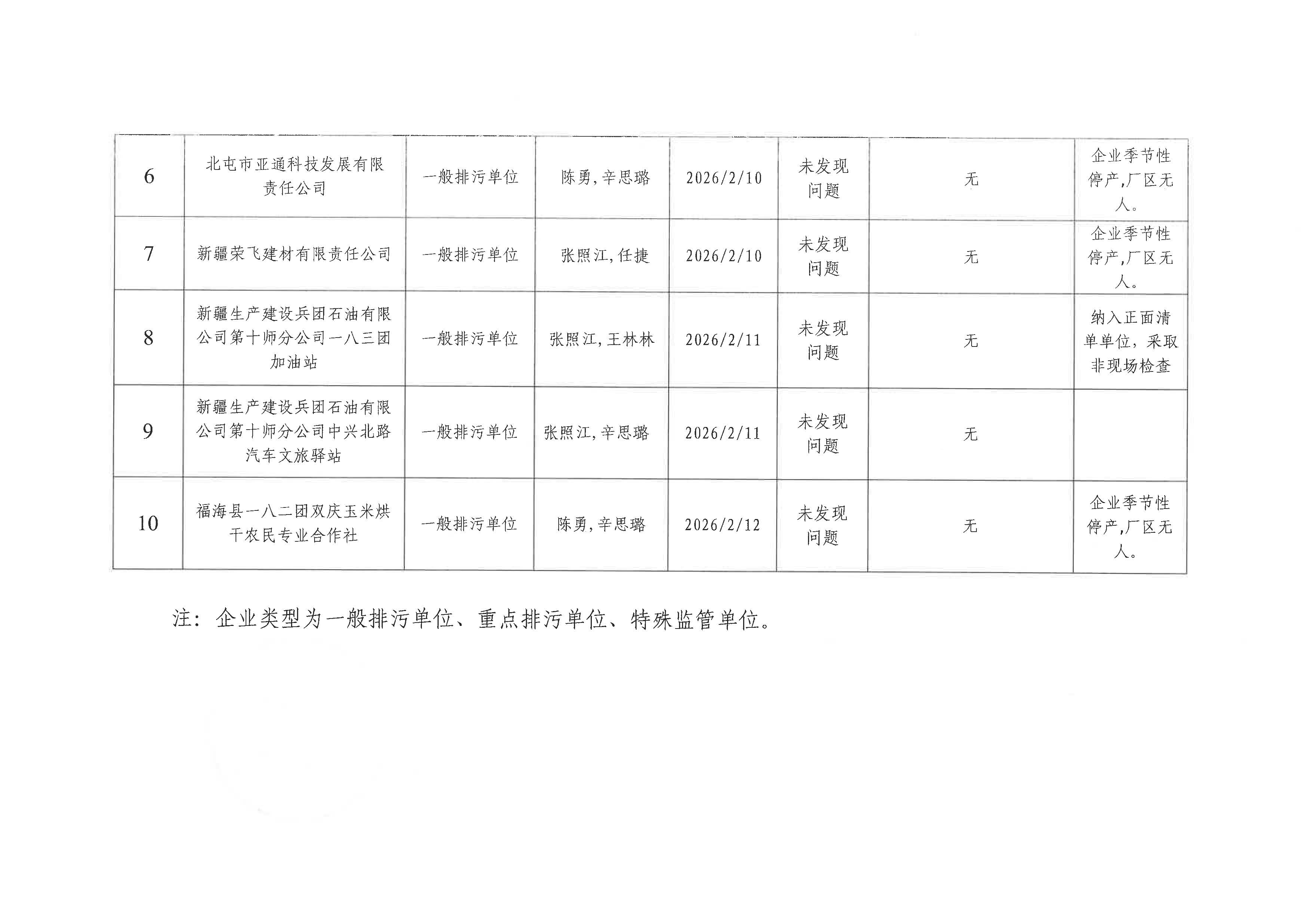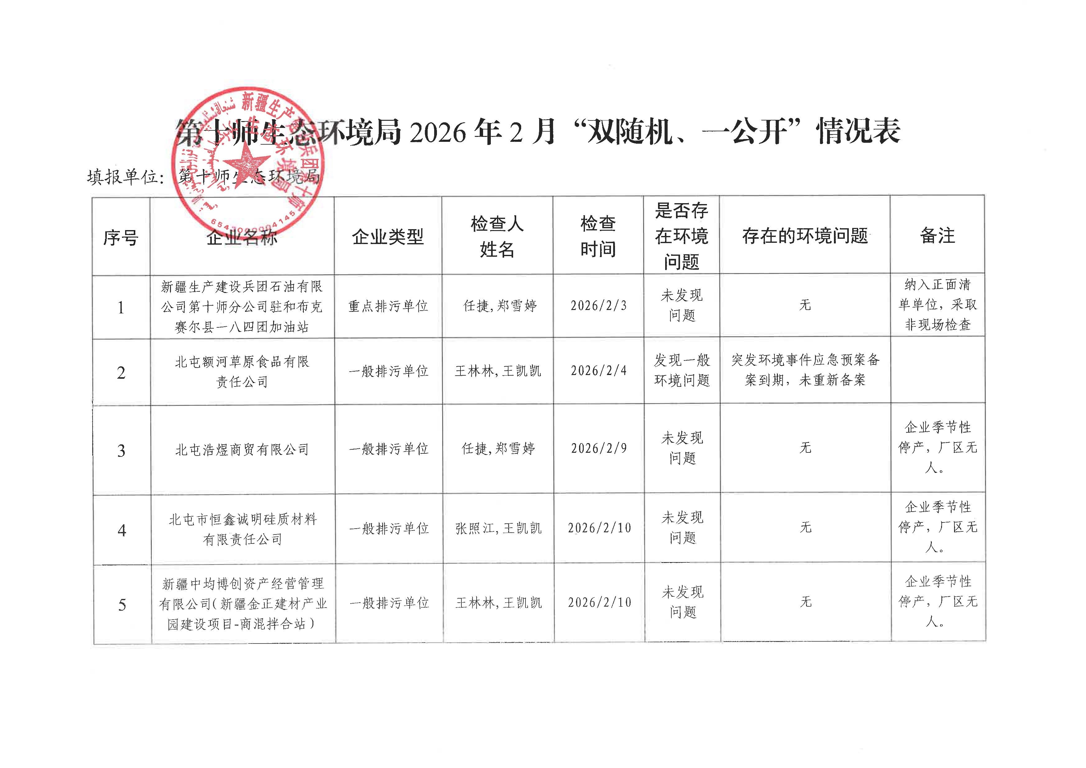 第十师生态环境局2026年2月“双随机、一公开”情况表