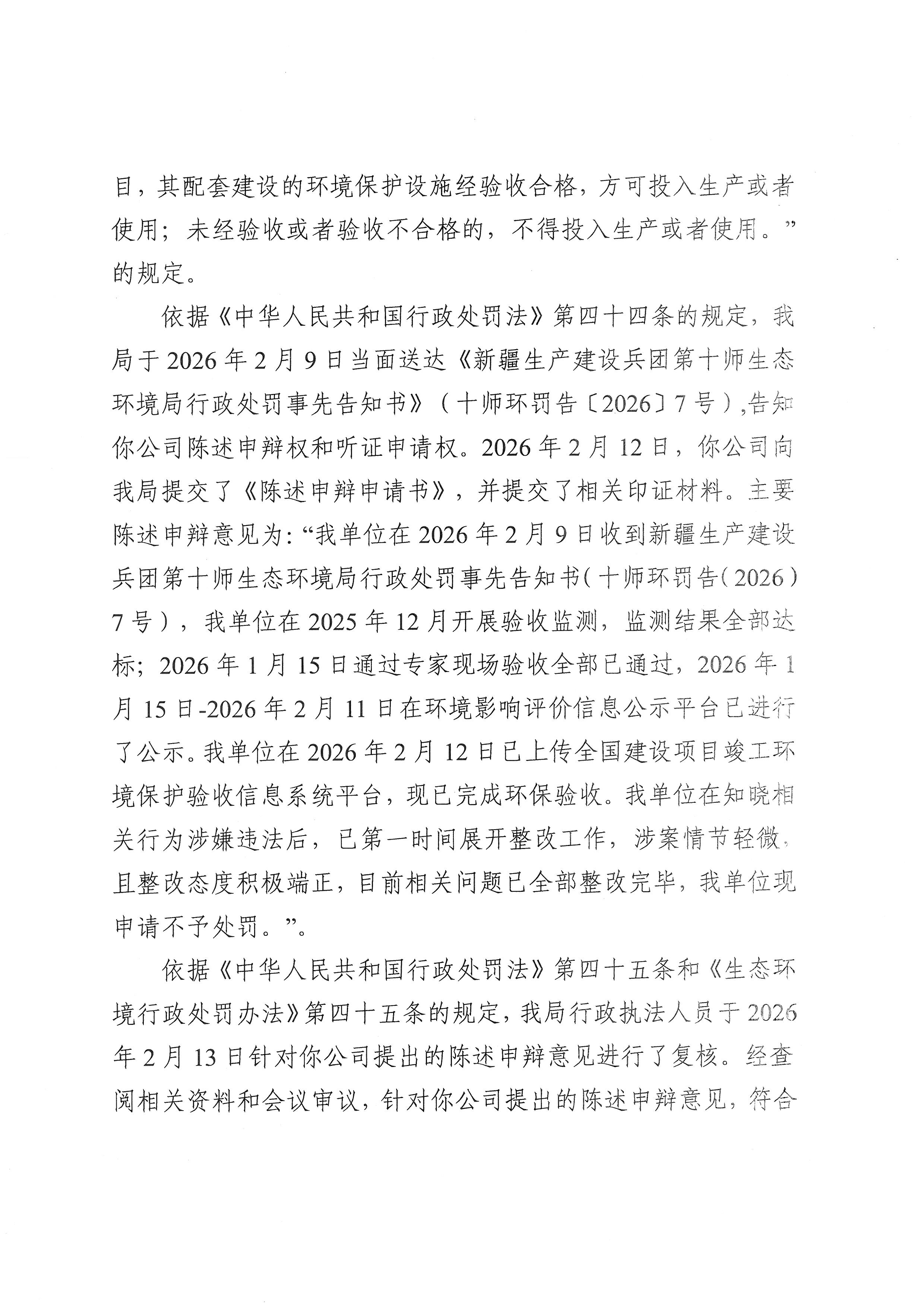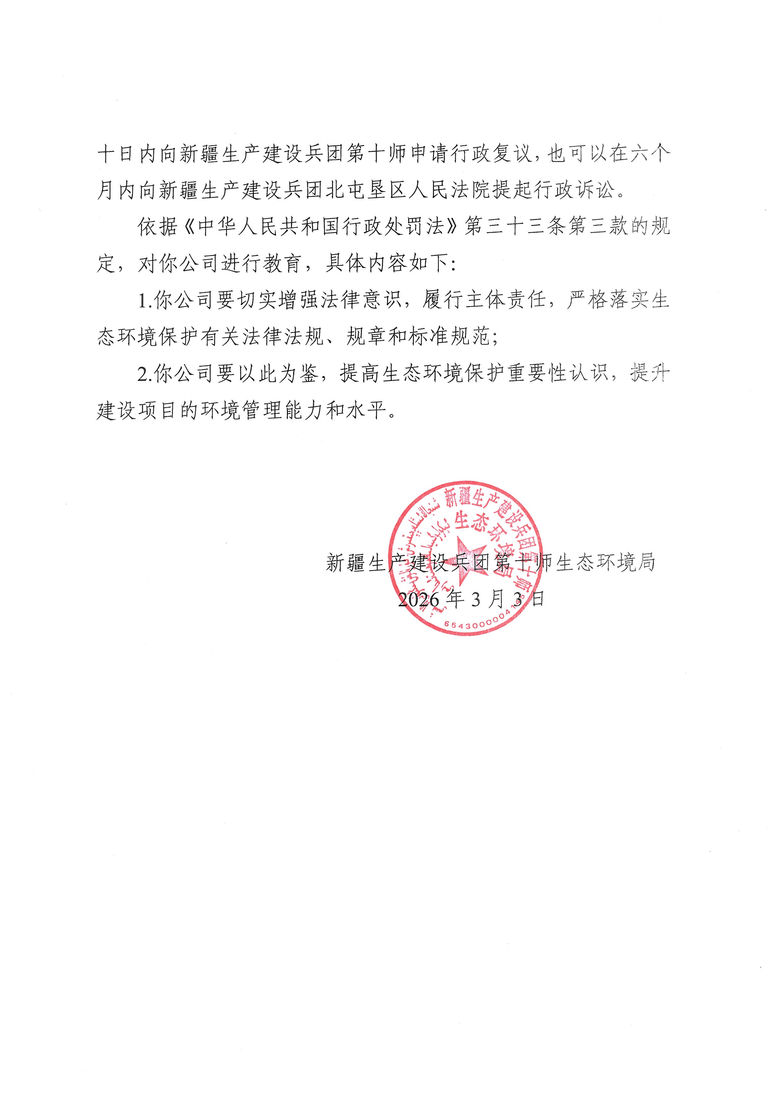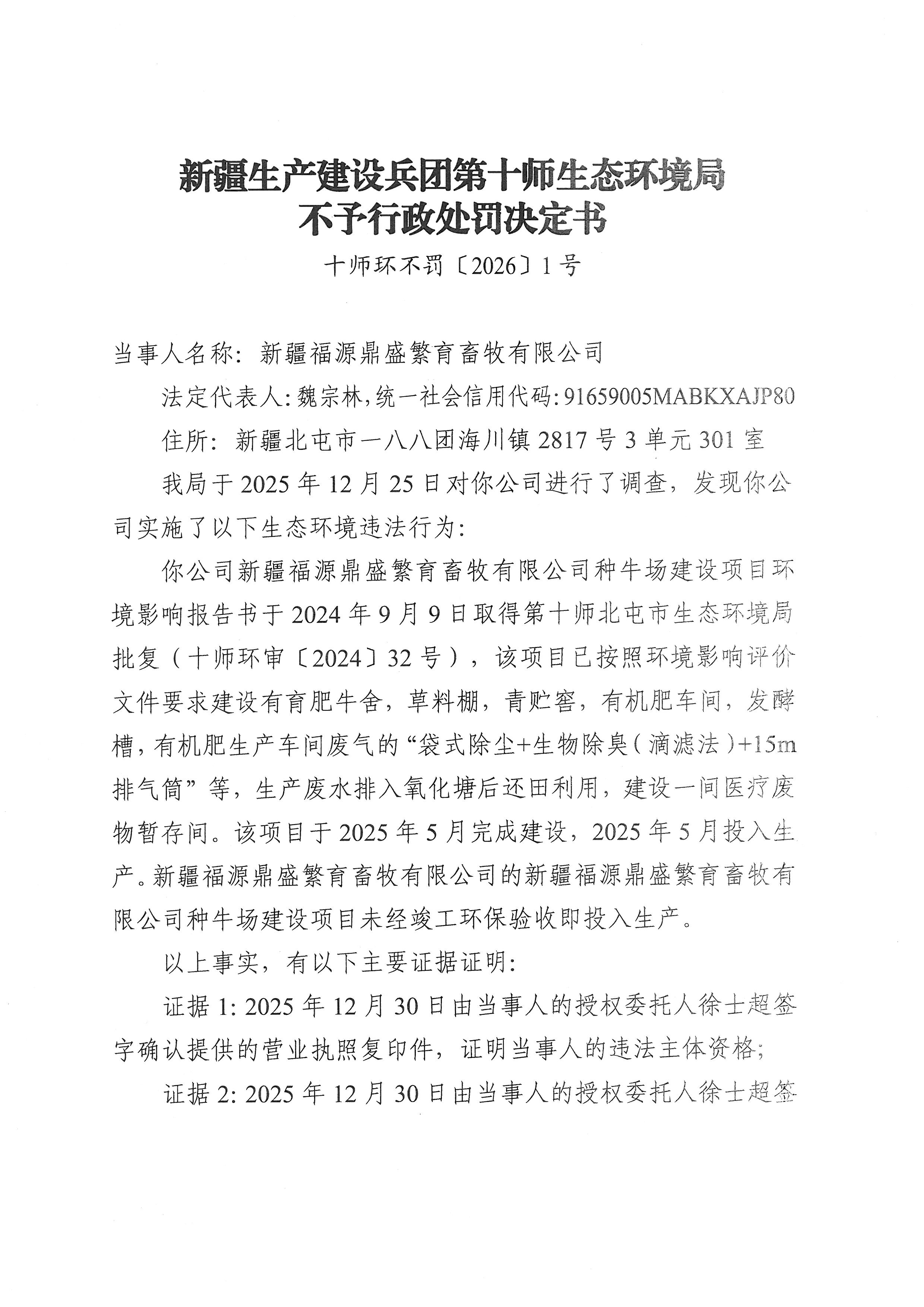 新疆生产建设兵团第十师生态环境局不予行政处罚决定书(十师环不罚〔2026〕1号)