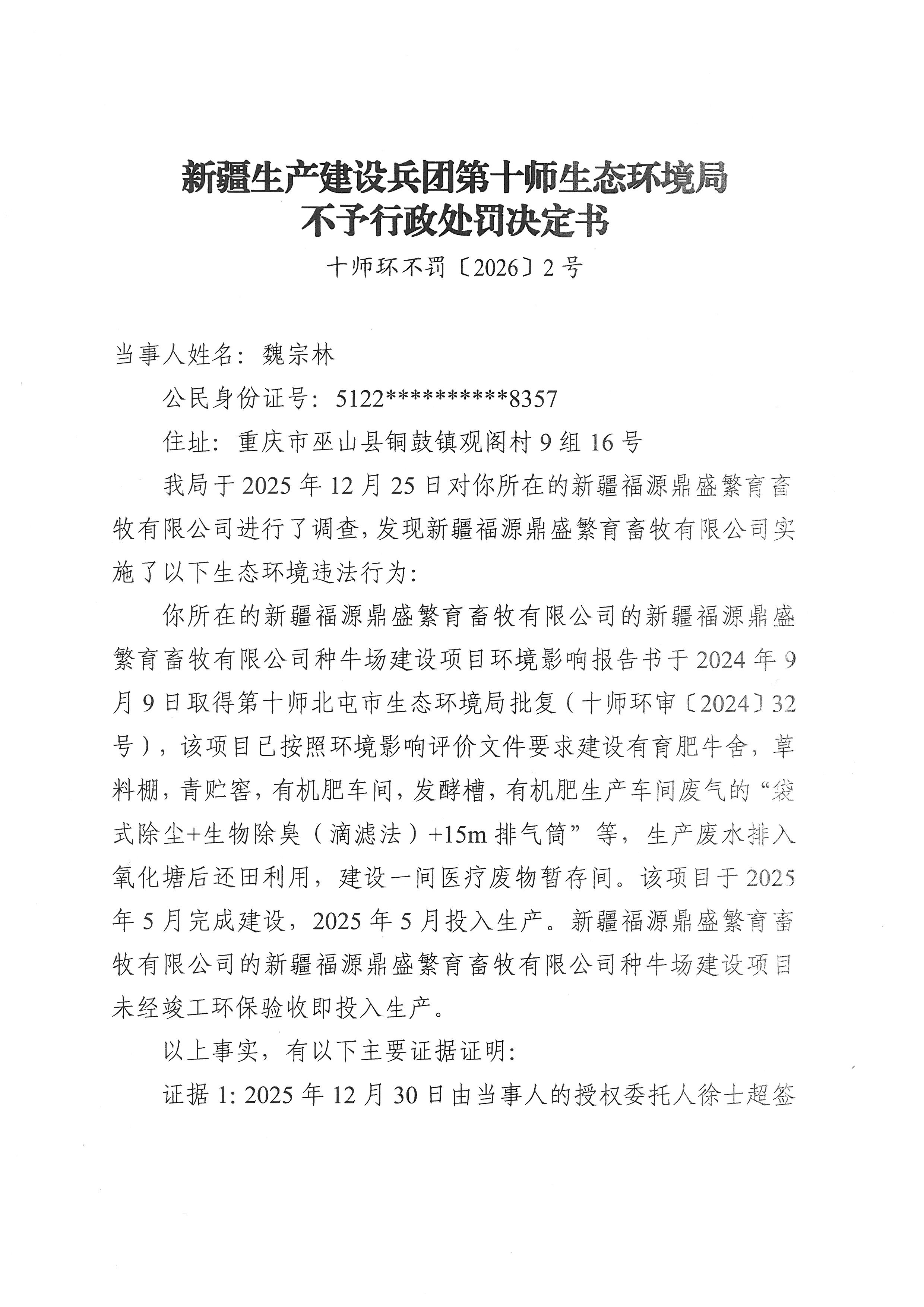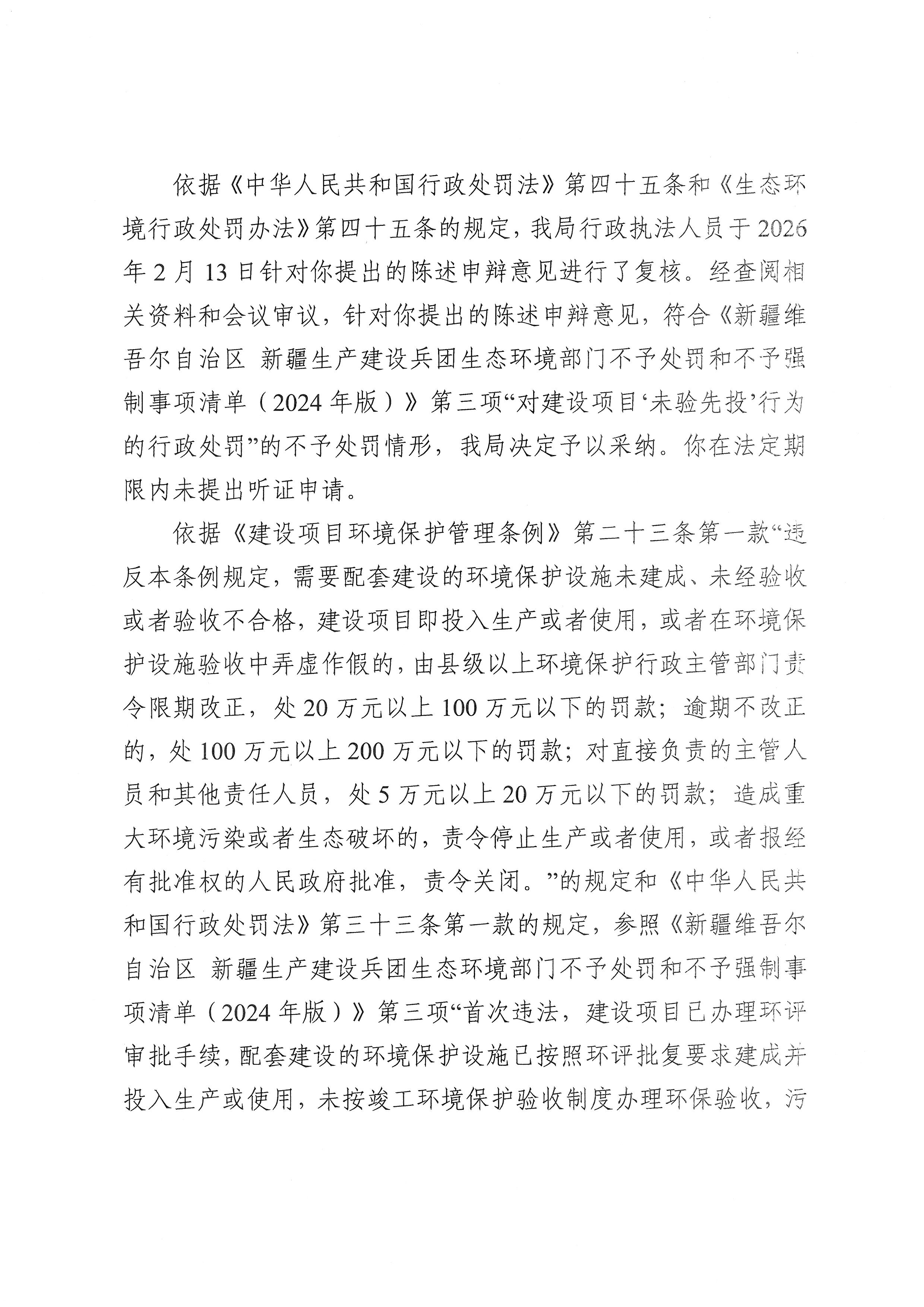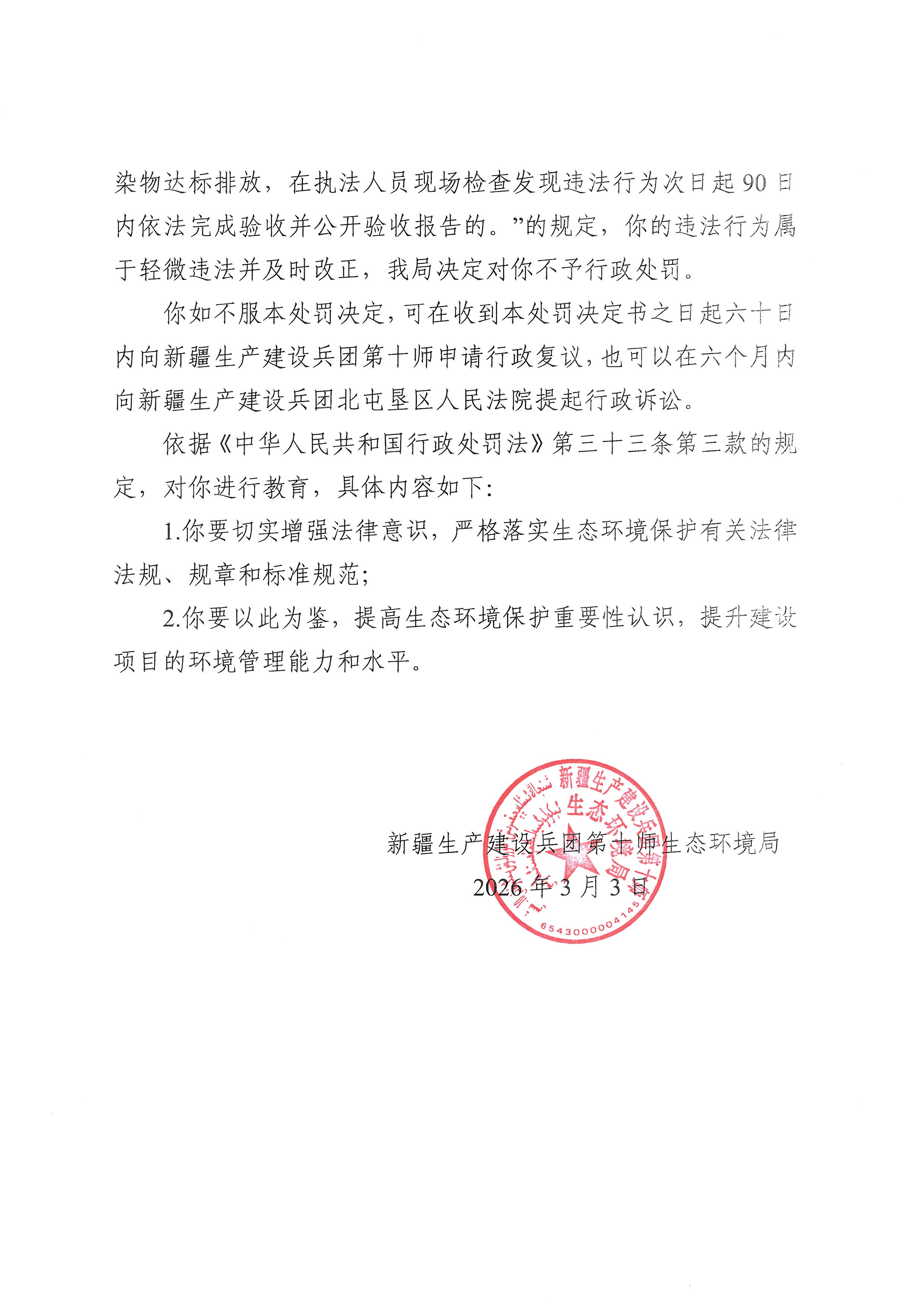 新疆生产建设兵团第十师生态环境局不予行政处罚决定书(十师环不罚〔2026〕2号)