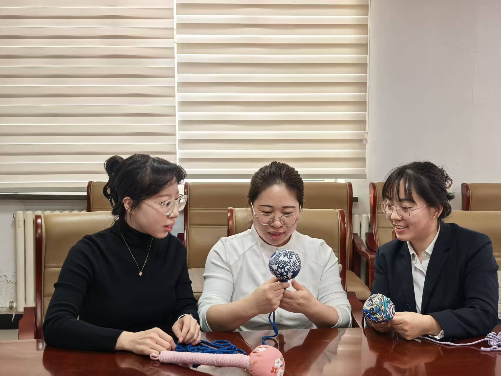 在温馨愉悦的手工实践环节,大家共同学习艾草锤制作流程,围坐协作、填充艾草、包裹布料、捆扎定型,现场氛围轻松和谐。一个个散发着淡淡艾草清香的养生锤顺利完成,既缓解工作疲劳,又让大家在动手创作中舒缓压力、增进情谊,充分展现了积极向上、温婉雅致的精神风貌。