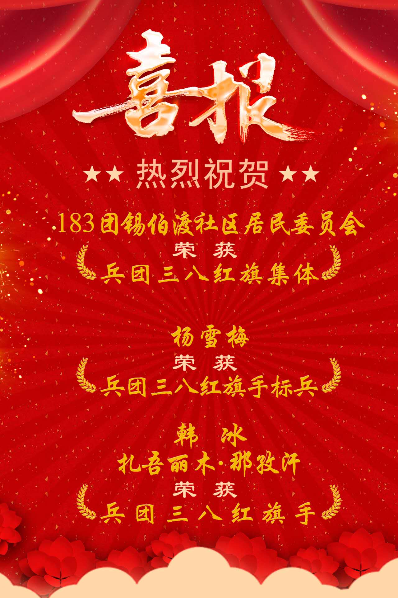 为表彰先进、树立榜样,激励兵团广大妇女自尊、自信、自立、自强,与党同心、跟党奋斗,积极投身中国式现代化兵团实践,兵团妇联授予杨雪梅等10人为兵团三八红旗手标兵称号,授予韩冰等50人兵团三八红旗手称号,授予183团锡伯渡社区居民委员会等 30 个单位兵团三八红旗集体称号。其中:第十师1人荣获兵团三八红旗手标兵称号,2人荣获兵团三八红旗手称号,1个集体荣获兵团三八红旗集体称号。