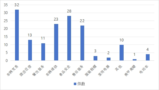从投诉举报问题来看:车辆交易类32件、酒店住宿类5件、餐饮服务类11件、车辆维修类23件、食品安全类28件、售后服务类22件、服装鞋帽类3件、家用电器类2件、美甲美睫类1件、电动车类4件。