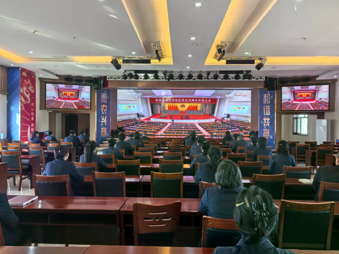 十师北屯市农商银行组织干部职工观看新疆维吾尔自治区成立70周年庆祝大会。胥强 摄