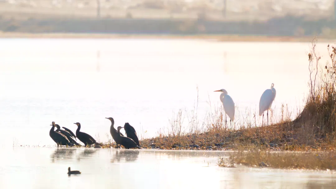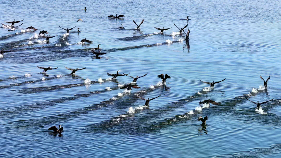 在广阔的湖面上,候鸟大军构成了一道流动的风景线。成群的大雁和赤麻鸭在水面悠然游弋,它们或成群结队、或三三两两,时而振翅高飞时而掠水低旋,鸬鹚和白鹭优雅地站立在芦苇岸边休憩。大批迁徙的候鸟以灵动身姿穿梭于湿地之间,与澄澈水域、斑斓草木共同绘就了一幅秋日生态画卷。